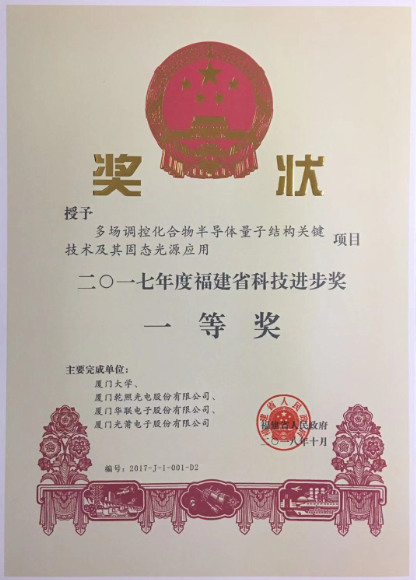 八、10月31日,福建省人民政府發(fā)文公布《2017年度福建省科學(xué)技術(shù)獎勵和專利獎勵的決定》。乾照光電與廈門大學(xué)、廈門華聯(lián)電子股份有限公司、廈門光莆電子股份有限公司聯(lián)合申報的“多場調(diào)控化合物半導(dǎo)體量子結(jié)構(gòu)關(guān)鍵技術(shù)及其固態(tài)光源應(yīng)用”從454項科技進(jìn)步獎項目中脫穎而出,榮獲福建省科技進(jìn)步獎一等獎。