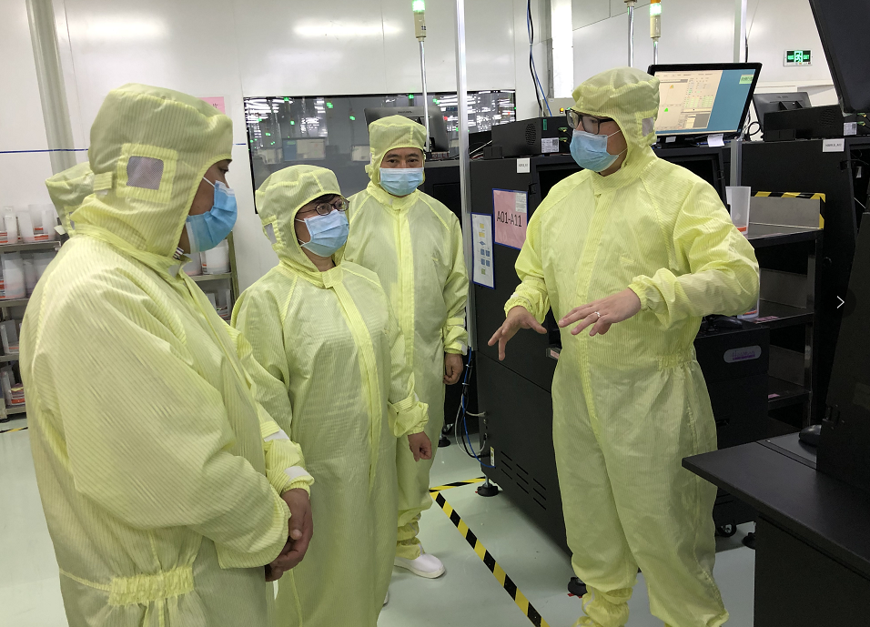 在公司展廳,陳文戎向調(diào)研組一行介紹了公司發(fā)展歷程、生產(chǎn)經(jīng)營狀況以及產(chǎn)品技術(shù)優(yōu)勢和應用領(lǐng)域。在車間,調(diào)研組一行觀摩了外延片生產(chǎn)相關(guān)工藝流程及芯片點測、分選流程,對公司的現(xiàn)代化智能生產(chǎn)技術(shù)和設備的運作程序給予了充分肯定。