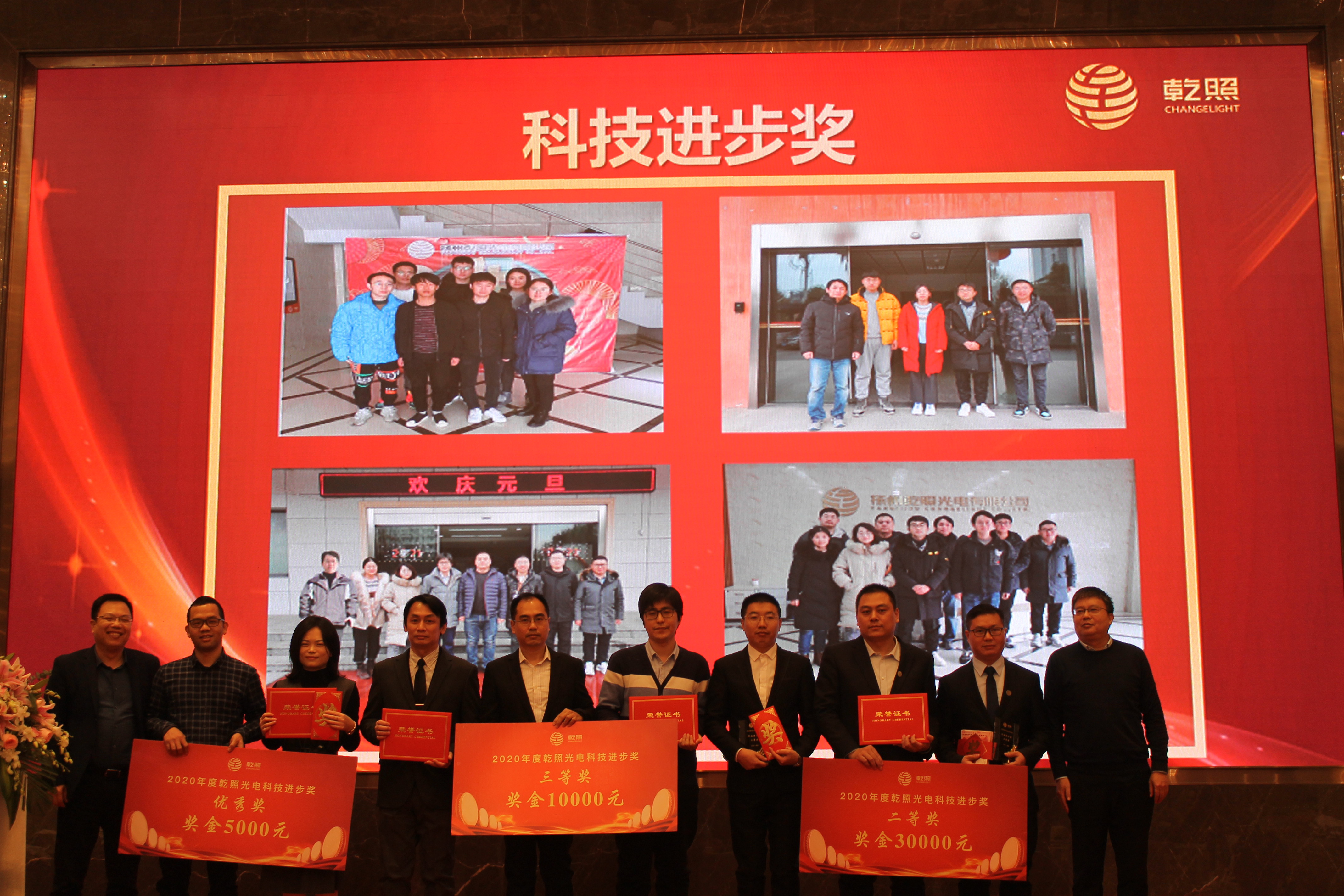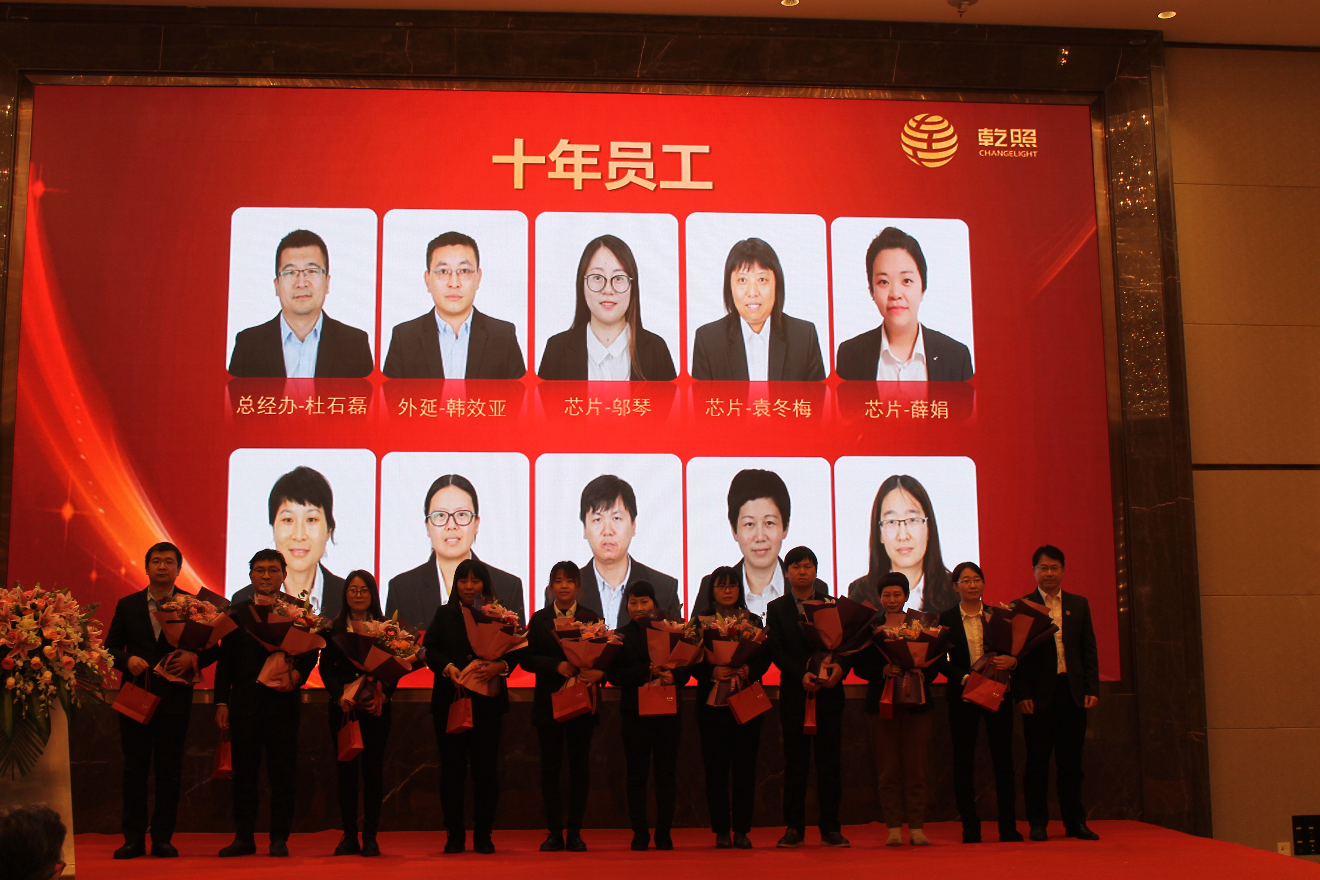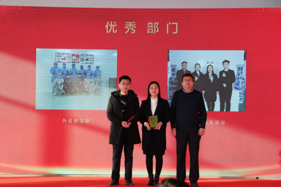 總結(jié)報告后,公司對2020年工作中表現(xiàn)突出的個人和團隊進行了表彰。此次表彰共設(shè)置了最佳新人獎、基層骨干獎,技術(shù)精英獎、管理卓越獎、優(yōu)秀部門獎、優(yōu)秀班組獎、科技進步獎、十年員工、安全評優(yōu)、黨支部優(yōu)秀黨員獎、“乾照十佳人物”等多類獎項。金章育為十佳人物一一頒獎,蔡海防為十年員工頒發(fā)十年紀念金幣。