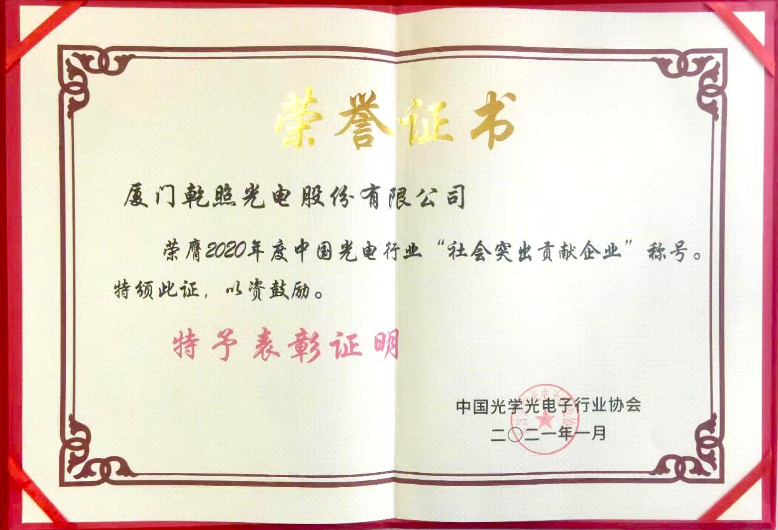 廈門(mén)乾照光電榮獲“2020年度中國(guó)光電行業(yè)‘社會(huì)突出貢獻(xiàn)企業(yè)’”稱號(hào)