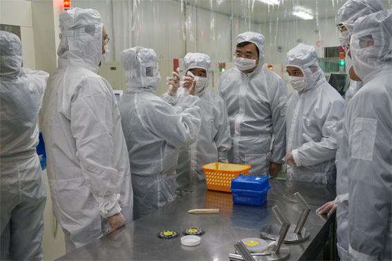 此次調(diào)研,我們陪同市委組織部的領(lǐng)導(dǎo)們參觀了芯片車(chē)間的工藝流程,并做了簡(jiǎn)單的工藝介紹。為了能夠近距離的了解到我們的產(chǎn)品,在開(kāi)發(fā)區(qū)管委會(huì)主任季允豐的陪下,同市委組織部部長(zhǎng)張愛(ài)軍等一行6人便穿著無(wú)塵服前去外研車(chē)間近距離的觀察、了解我們的產(chǎn)品及性能介紹,并對(duì)我揚(yáng)州乾照光電有限公司引進(jìn)的高層次人才給予了高度的認(rèn)可。