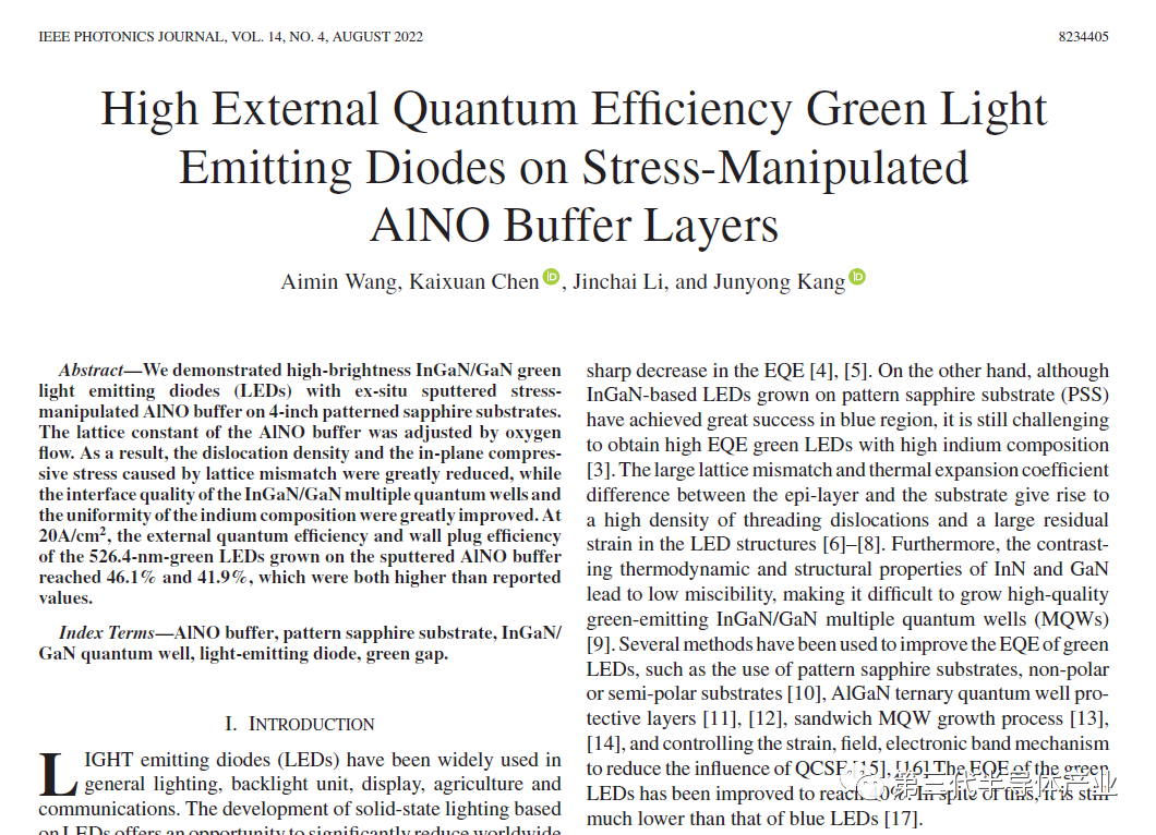 近日,廈門大學(xué)物理科學(xué)與技術(shù)學(xué)院與乾照光電協(xié)同攻關(guān),在提升綠光LED效率方面取得重大進展。該研究成果以“High External Quantum Efficiency Green Light Emitting Diodes on Stress-Manipulated AlNO Buffer Layers”為題發(fā)表于IEEE PHOTonICS JOURNAL 14(4) (2022) 8234405。