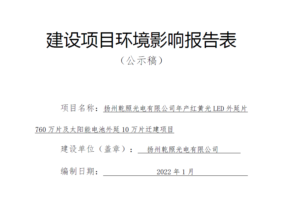 《揚(yáng)州乾照光電有限公司年產(chǎn)紅黃光LED外延片760萬(wàn)片及太陽(yáng)能電池外延10萬(wàn)片遷建項(xiàng)目環(huán)境影響報(bào)告表公示稿》 /uploadfiles/2022/04/20220402144205425.pdf 《揚(yáng)州乾照光電有限公司年產(chǎn)紅黃光LED外延片760萬(wàn)片及太陽(yáng)能電...