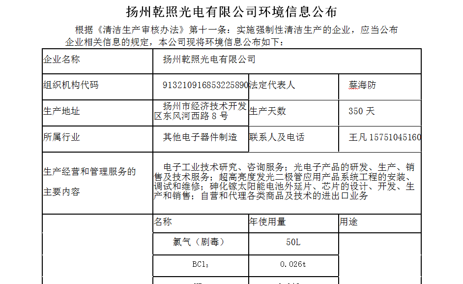 揚(yáng)州乾照光電有限公司環(huán)境信息公布
