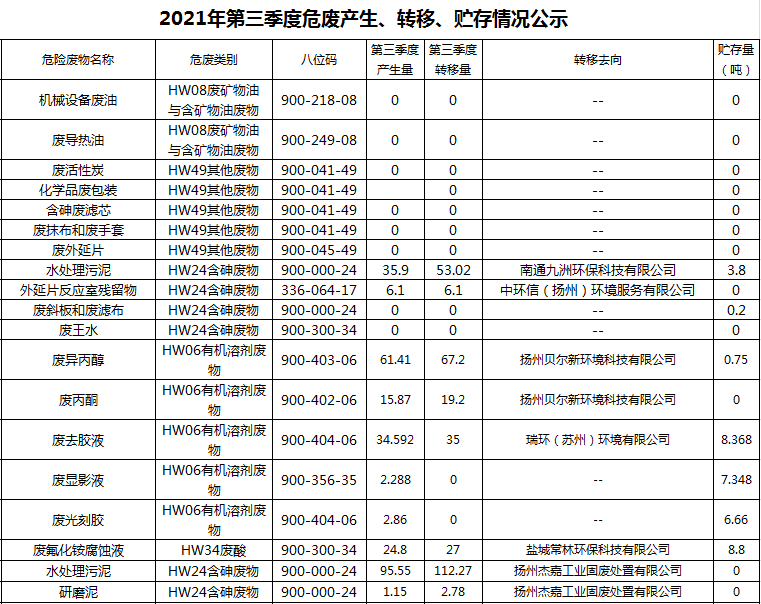 揚州乾照光電有限公司2021年第三季度危廢產(chǎn)生、轉(zhuǎn)移、貯存情況公示