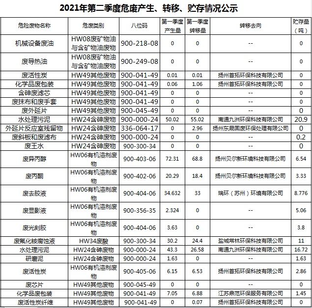 揚(yáng)州乾照光電有限公司2021年第二季度危廢產(chǎn)生、轉(zhuǎn)移、貯存情況公示