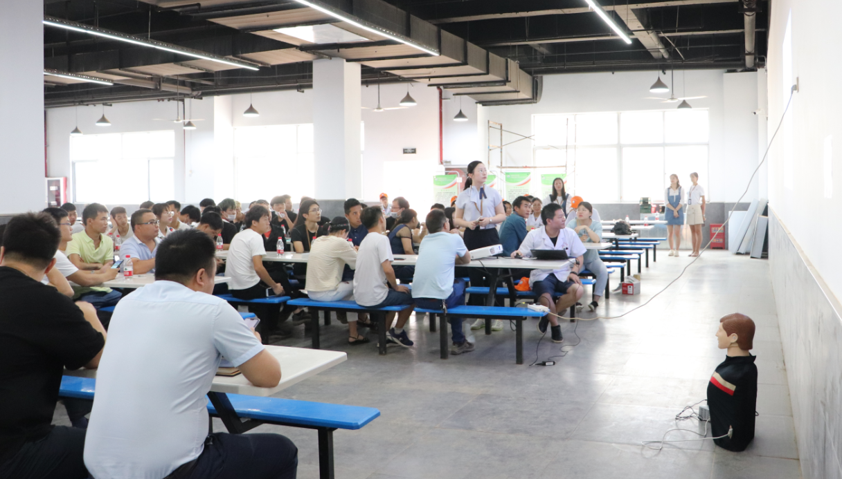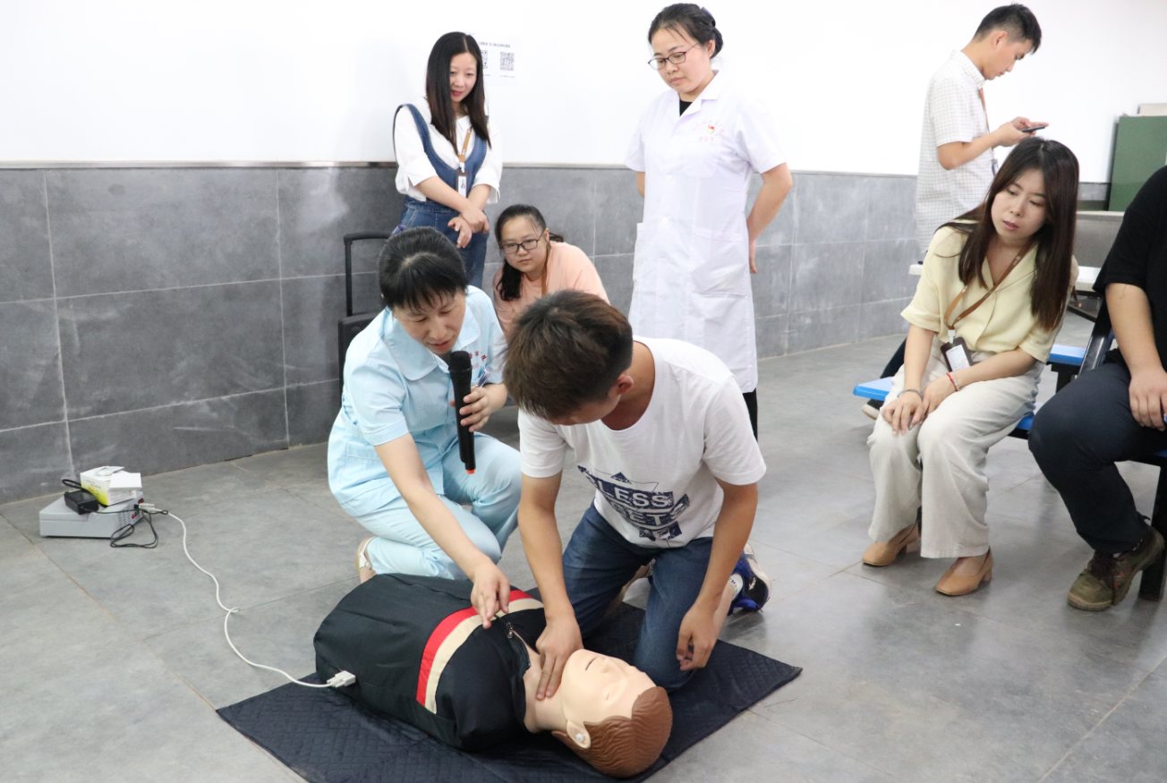 講座以理論和實踐相結(jié)合的方式展開,首先由江西省榮譽(yù)軍人康復(fù)醫(yī)院黎勇強(qiáng)、鐘笑兩位醫(yī)生分別對化學(xué)品灼傷,吸入有毒氣體的現(xiàn)場緊急處理、心肺復(fù)蘇的流程、外出血的現(xiàn)場處理、噎食的急救進(jìn)行了知識宣講。接著,高彩虹、付萍兩位醫(yī)生進(jìn)行了調(diào)整體位、打開氣道、判斷呼吸、人工呼吸、胸外心臟按壓等急救法的現(xiàn)場操作演示,并請員工們參與體驗,現(xiàn)場進(jìn)行急救操作,讓大家在輕松的教學(xué)氛圍中掌握心肺復(fù)蘇法的操作技能。
