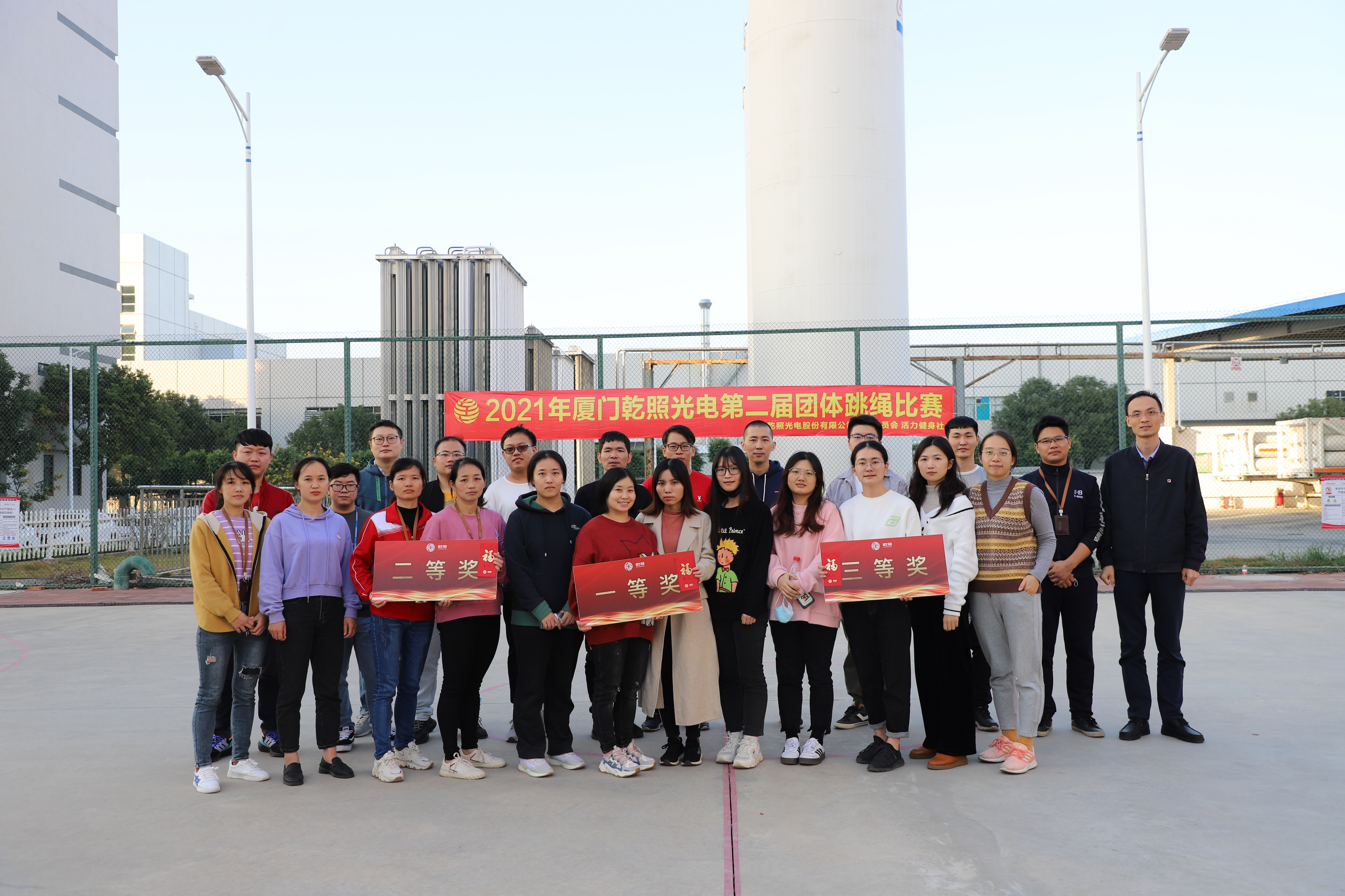 11月24日,廈門乾照光電舉辦第二屆團體跳繩比賽。本次跳繩比賽共有13隊108人報名參與。參賽項目分別有一帶一、多人同跳和集體跳大繩三項。比賽前,來自活力健身社的社長蔡書衛(wèi)帶領大家開展賽前熱身訓練。