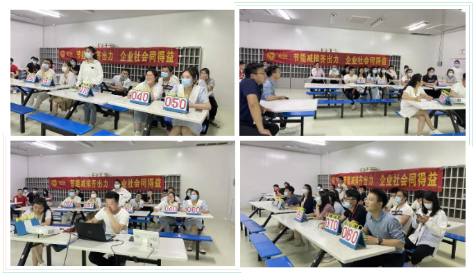 隨后,在公司培訓室又進行了一場關于能源管理的培訓并同步開展知識答題競賽活動?,F(xiàn)場共吸引30名員工參與,經(jīng)過工作人員系統(tǒng)講解能源和環(huán)保管理等方面的相關知識后,緊張而又激烈的知識競賽就開始了!競賽中,五人一組,隨機搶答,選手們全神貫注、認真思索,以昂揚的斗志、飽滿的熱情投入到比賽中?,F(xiàn)場氣氛活躍,最后經(jīng)過激烈PK,六名選手獲得了本次比賽大獎!