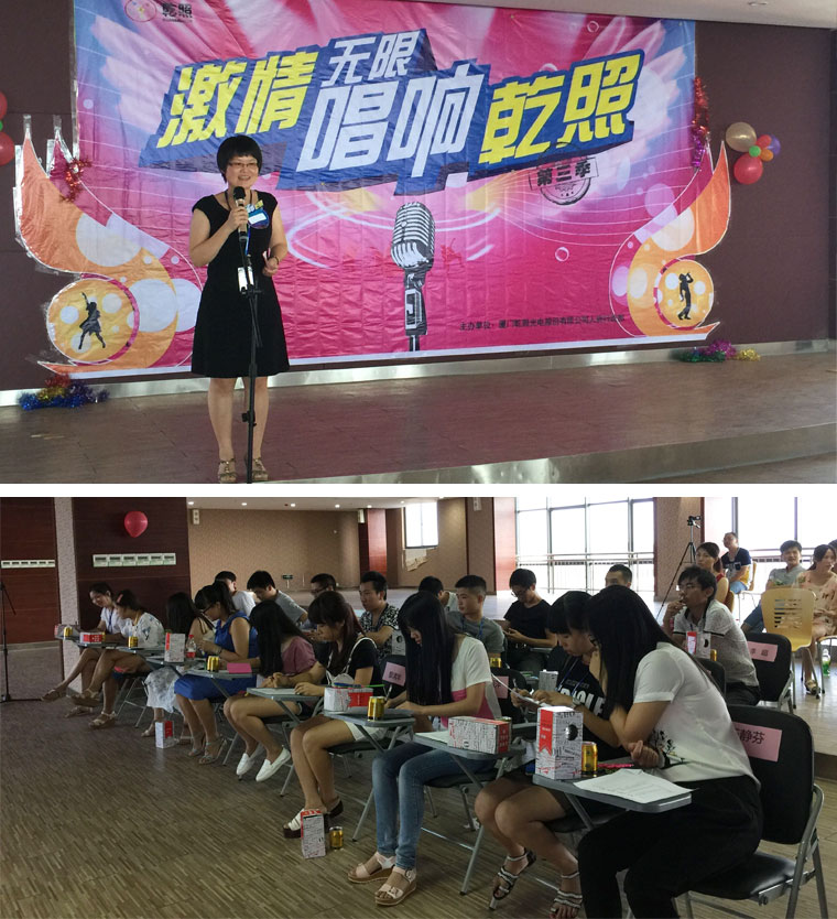 該比賽在辦公樓8樓大禮堂舉行,雖然沒有專業(yè)的場地,但負責(zé)此次活動的組委會成員各揚己長,設(shè)計海報,宣傳報名、布置場地,選拔主持人、拉贊助等,實現(xiàn)了小制作,大實現(xiàn)的效果。組委會還給選手評委準備貼心小禮物,讓大家由衷地感受到他們的用心。本次比賽不僅是為大家提供展示歌唱風(fēng)采的舞臺,更讓大家感受到了乾照這個大家庭的溫馨,推動了我司員工精神文明的建設(shè)。讓我們期待下一季的歌唱比賽吧!