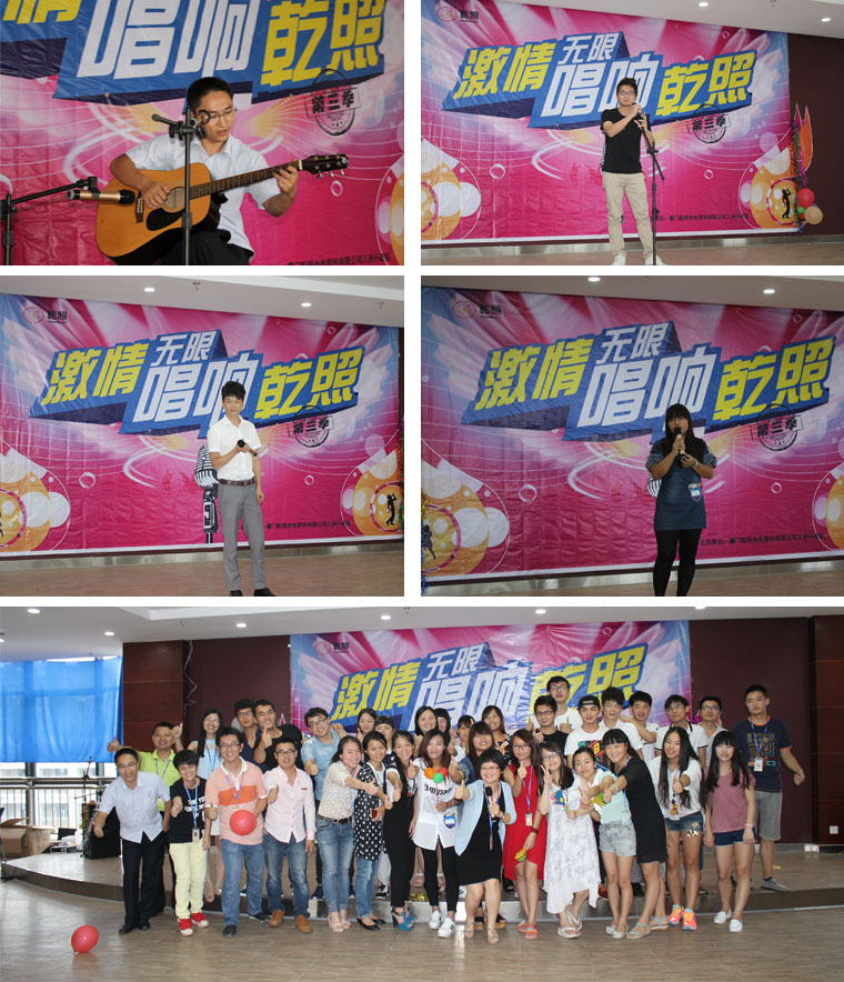 本季歌唱比賽旨在為公司尾牙活動選拔才藝類節(jié)目,發(fā)揮發(fā)掘大家文藝方面的才能,同時通過對企業(yè)文化的發(fā)揚達到促進對員工的影響,開拓創(chuàng)新思維。各位參賽選手準備充分,發(fā)揮最優(yōu)水準。各位大眾評委通場與歌手互動,比賽現(xiàn)場始終洋溢著隆重?zé)崃业臍夥铡R皇子赏庋又圃觳吭O(shè)備組洪輝柏的獨唱《你是我的眼》,拉開了比賽的序幕。整場比賽歌聲悠揚,現(xiàn)場氣氛火爆,洋溢著濃郁的節(jié)日氣氛。兩首不同風(fēng)格的《海闊天空》在外延部戴金途和采購部陳明郅的演繹下,把比賽推向高潮?,F(xiàn)場吸引了各個部門領(lǐng)導(dǎo)、員工前來觀戰(zhàn),并不時贏得陣陣掌聲和歡呼聲。在經(jīng)過緊張激烈的評選后,最終有11名選手進入復(fù)賽。在8月27號下午,決賽終于開始了。選手們雖然心情更加緊張,但一上臺就盡情歌唱,臺下的評委也給出了公正公平的分數(shù)。本次比賽也秉承著“友誼第一,比賽第二!”的宗旨,有的選手雖然沒獲獎,但他們非常享受這個舞臺。最終,芯片部的陳健文演唱的一首《小情歌》虜獲了所有評委的心,獲得冠軍,外延部的戴金途取得亞軍,研發(fā)部的姜偉取得季軍的好成績。